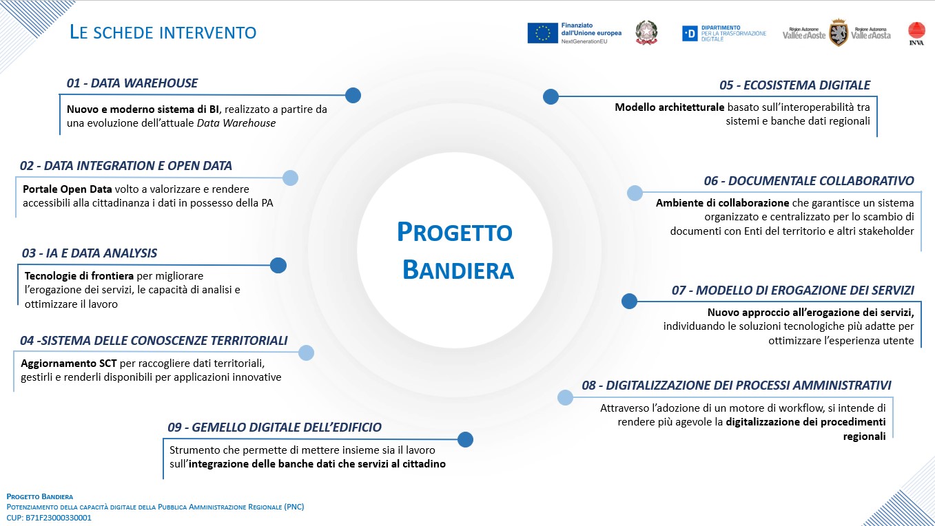 Al fine di raggiungere gli obiettivi previsti dal Piano Operativo del Progetto Bandiera e dare attuazione a quanto previsto dalle 3 linee di intervento, è stato definito un sistema organico di nove interventi tra loro coerenti e coordinati.